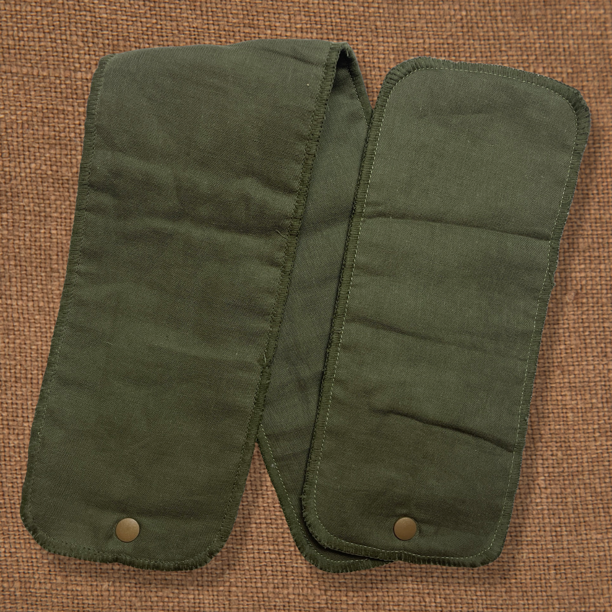 - 1 snake style insert: 7 total layers: 6 layers of olive green, 100% Cotton Muslin (110GSM) and 1 layer of white Bamboo Fleece, 30% Cotton/70% Bamboo Viscose (330GSM)