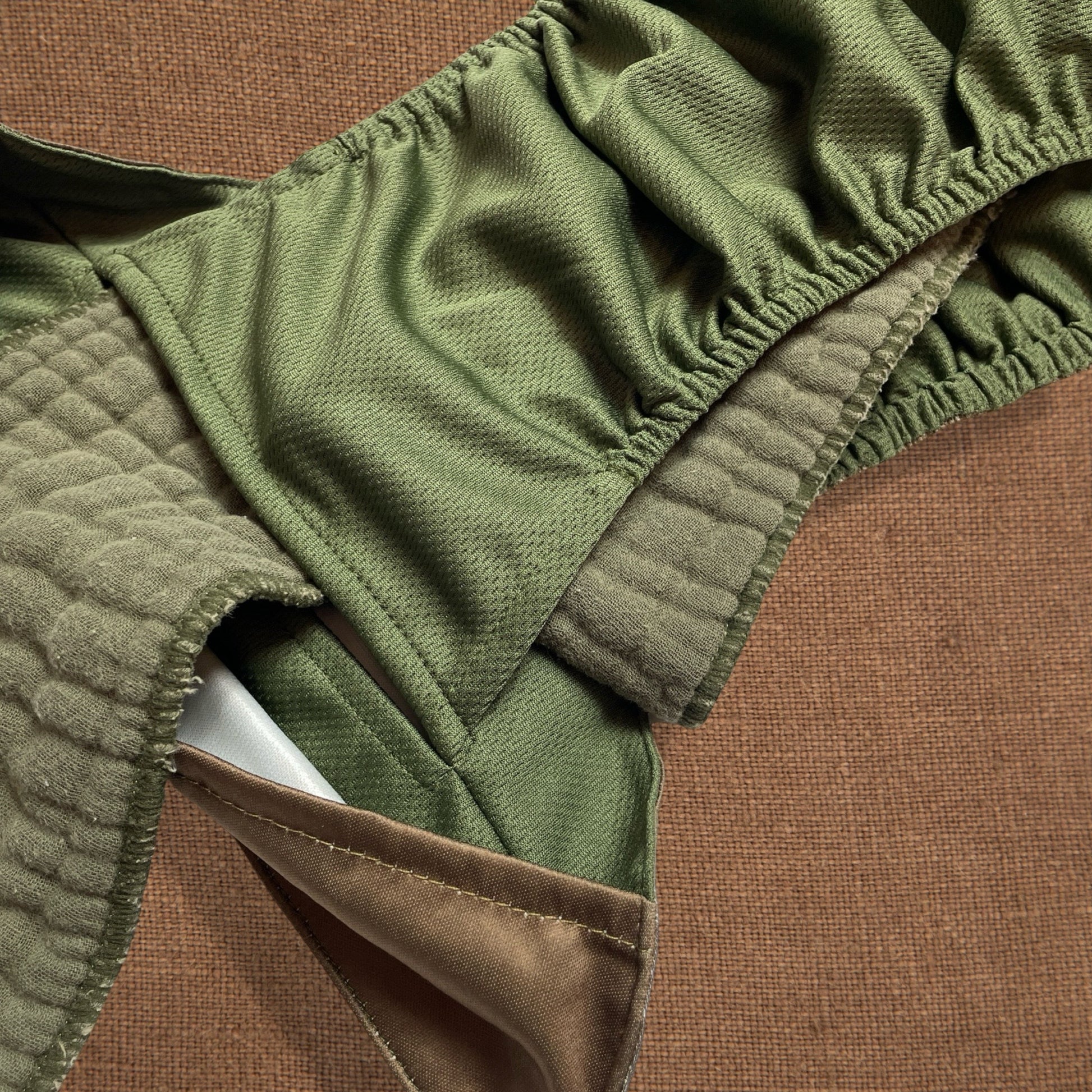 - Inner Layers: 1 layers of Sage colored AWJ (Athletic Wicking Jersey) to create the pocket and 1 layer of AWJ to create Floating Gusset™️